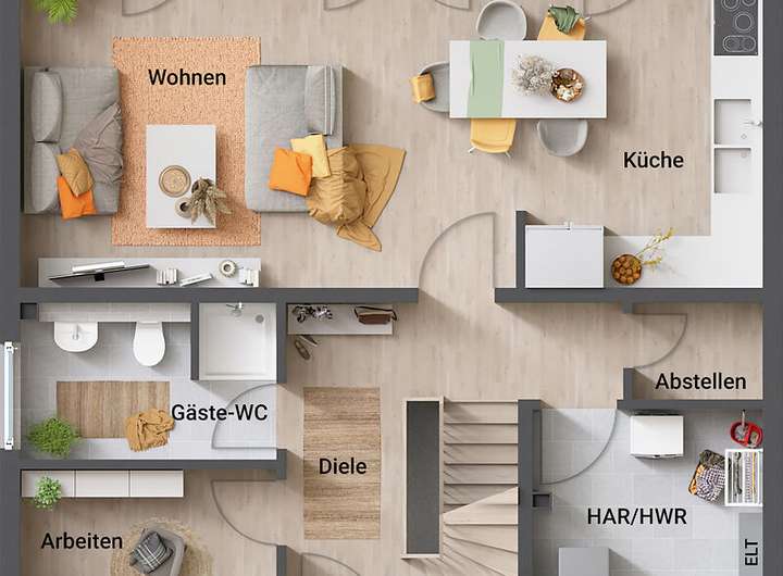 Ihr Haus wird schlüsselfertig übergeben, d.h. Sie gestalten nur noch die Innenwände in Ihrer Lieblingsfarbe und verlegen die übrigen Bodenbeläge!