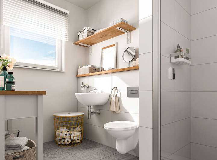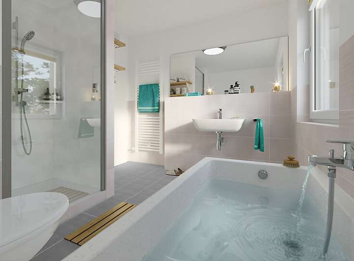 Das Flair 113 bietet alles, was ein Massivhaus gemütlich macht. Im Erdgeschoss betreten Sie ein geräumiges Wohn- und Esszimmer, eine Küche mit genügend Freiraum, ein Gäste-WC und einen Hauswirtschaftsraum mit ausreichend Platz für Waschmaschine und Co. Im Dachgeschoss erwarten Sie neben drei weiteren geräumigen Zimmern ein komfortabel ausgestattetes Badezimmer.