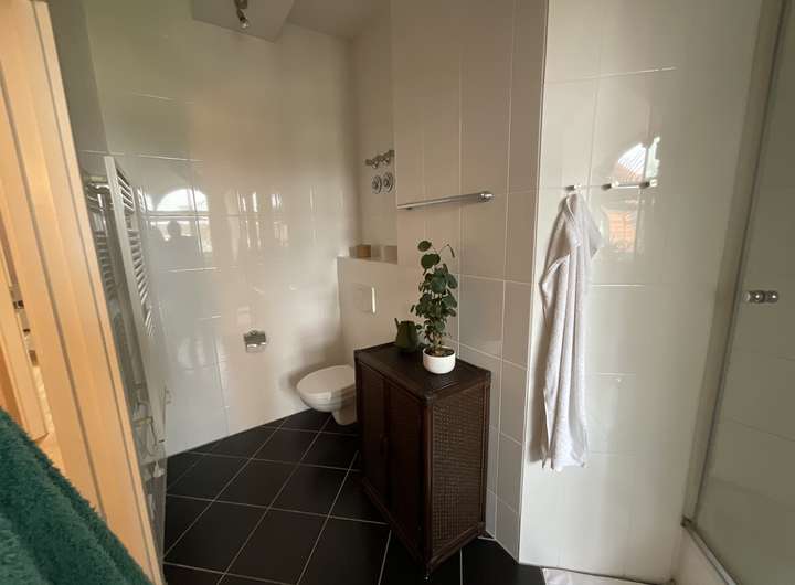 Dort oben befindet sich das große Badezimmer mit Wanne und Dusche sowie ein sehr angenehm helles und großes Schlafzimmer mit Klimaanlage.