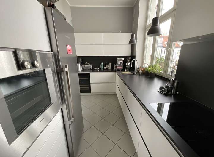 Vom Wohnzimmer gehen Sie in die Küche mit neuwertiger edler Einbauküche und einem separaten Abstellraum.