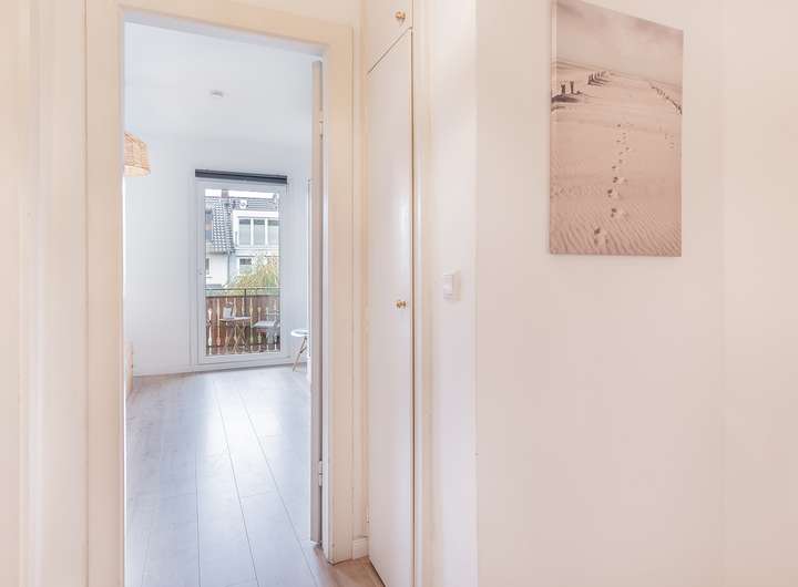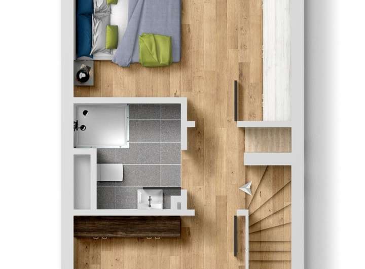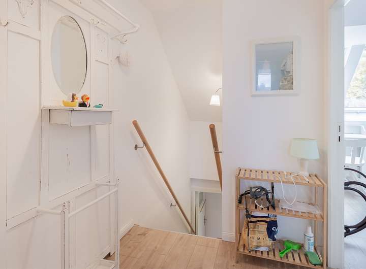 Über eine attraktive Holztreppe erreichen Sie das Obergeschoss, wo sich das gut geschnittene Schlafzimmer mit Balkon, als auch ein weiteres Gäste-/ Kinderzimmer und das attraktive Duschbad mit Glasduschwand und Waschmaschinenanschluss befinden.