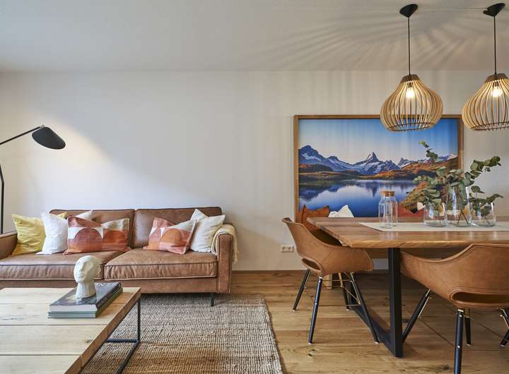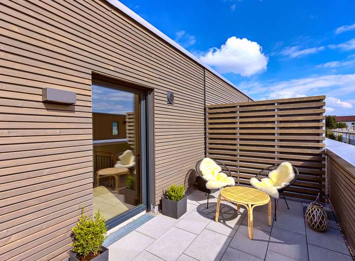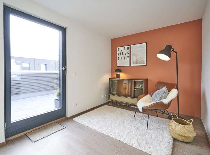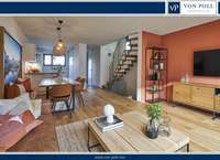Der großzügige Wohn- und Essbereich im Erdgeschoss bildet das Herzstück des Hauses. Von hier aus gelangen Sie direkt in den sonnigen Garten, der – ebenso wie die imposante Dachterrasse – nach Süden ausgerichtet ist. Die Dachterrasse ist dabei vom Erdgeschoss aus nicht einsehbar und bietet so ein hohes Maß an Privatsphäre.