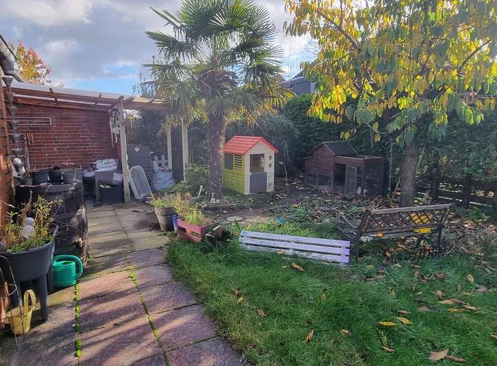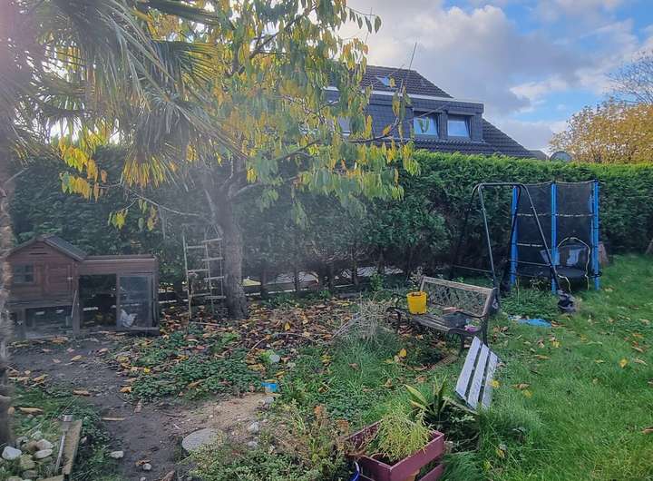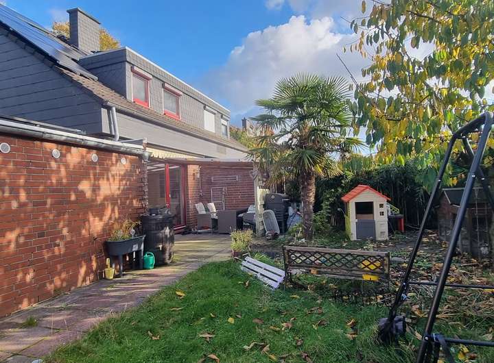 Der gepflegte Garten, welcher mit einem schönen Kirschbaum und einer Palme bestückt ist, bietet viel Potenzial für Gartenaktivitäten und erstreckt sich vollständig um die Doppelhaushälfte. Weiterhin stehen Ihnen eine Garage zur Verfügung. Das Garagendach- und Tor wurden in 2020 erneuert.