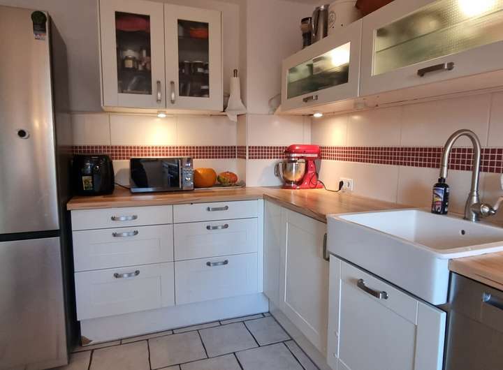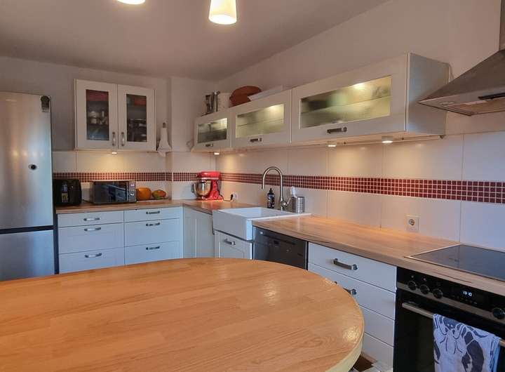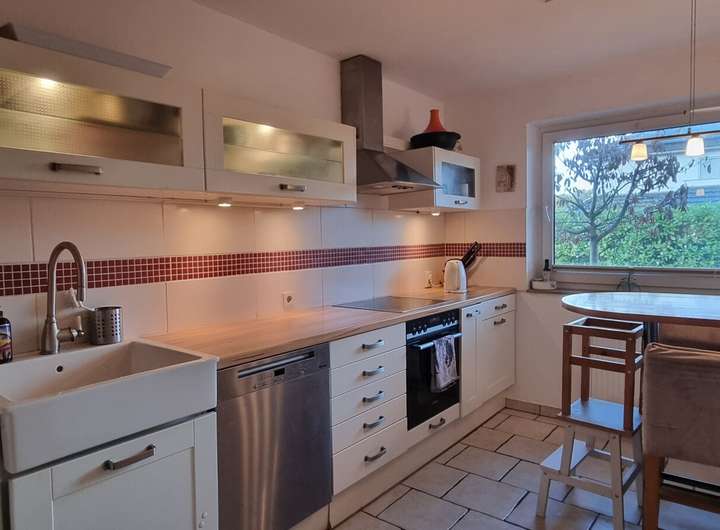 Die Küche ist mit einer schicken Einbauküche aus 2015/2017 versehen, in der die Elektrogeräte zwischen 2022 und 2025 bereits erneuert wurden. Hier kann ebenfalls ein kleiner Esstisch gestellt werden.