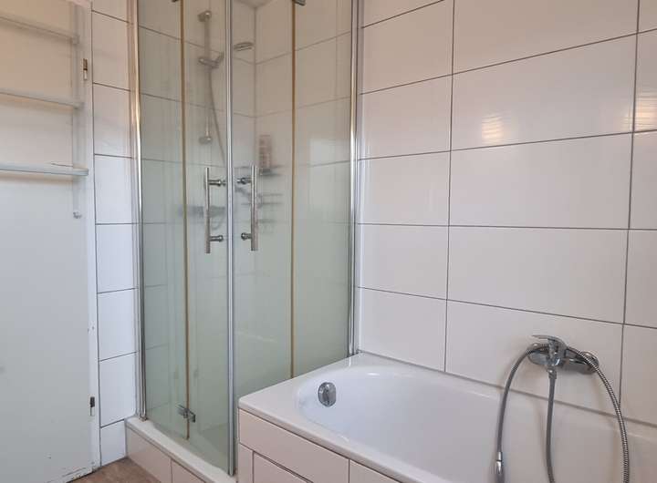 Das Badezimmer ist mit einer Dusche, einer Badewanne, einem Waschtisch und einem WC versehen.