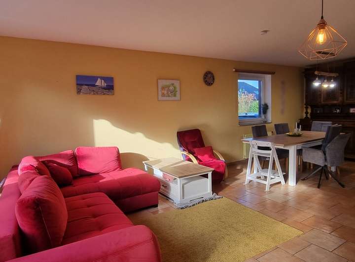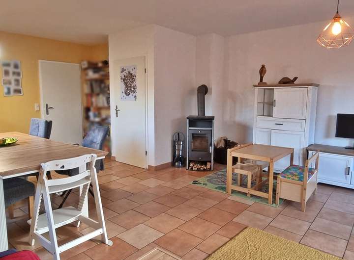 Im Erdgeschoss befinden sich eine Diele, eine Küche, ein großzügiger Wohn- und Essbereich und ein praktisches Gäste-WC. Die offene Gestaltung des Wohn- und Essbereichs bietet ausreichend Platz für einen großen Esstisch. Diese Räumlichkeit (mit Kaminofen) bildet das Herzstück der Immobilie und bietet den direkten Zugang in den schönen Garten mit Terrasse.