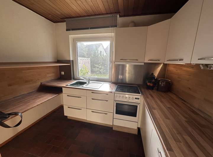 Das Erdgeschoss teilt sich auf in Gäste-Bad, Einbauküche, Schlafzimmer und großzügiges Wohnzimmer mit zwei Ausgängen auf die Terrasse und in den Garten.