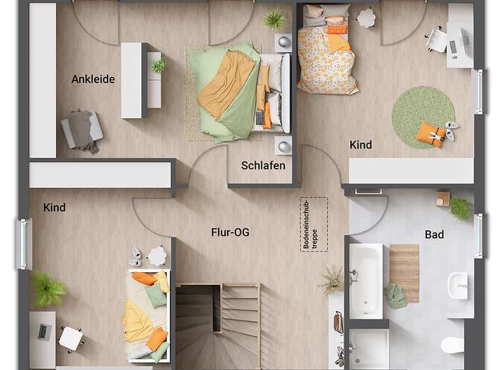 Im Obergeschoss warten drei gut geschnittene Zimmer auf Sie, die sich ideal als Kinderzimmer, Schlafzimmer oder Gästezimmer eignen. Große Fenster sorgen auch hier für viel Licht und eine freundliche Atmosphäre. Besonders praktisch: Das Elternschlafzimmer verfügt über eine eigene Ankleide mit viel Platz für Kleidung und Stauraum.