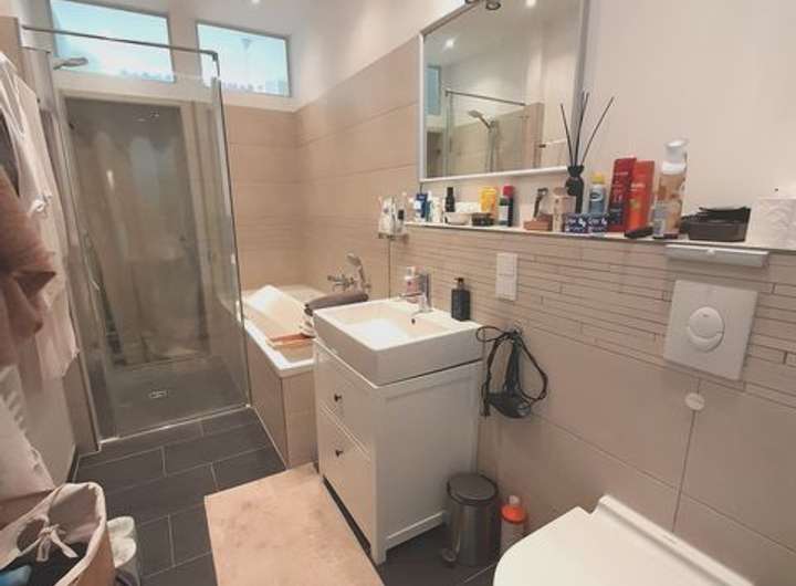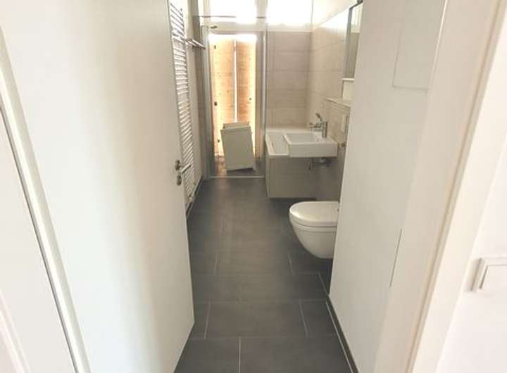 Das moderne Badezimmer hat zwei Zugänge und ist sowohl vom Wohnbereich und auch direkt vom Schlafzimmer aus zugänglich.