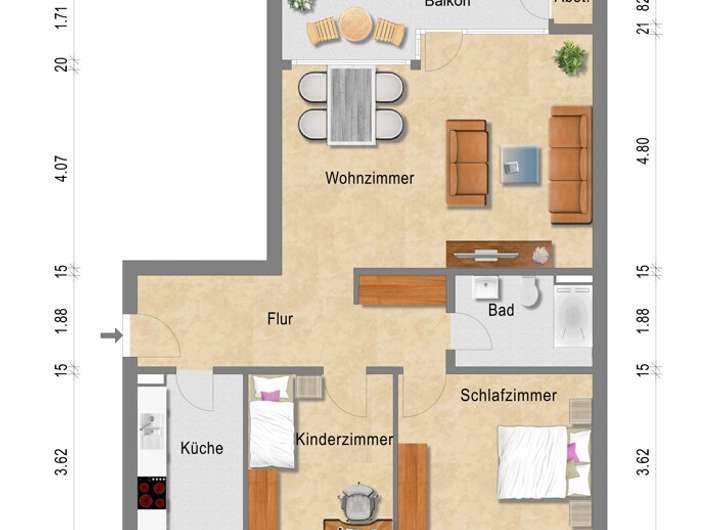 Die modernisierte Wohnung überzeugt durch ein helles, großzügiges Wohnzimmer (ca. 29 m²) mit ausreichend Platz für einen Essbereich und verfügt über einen direkten Zugang zum sonnigen, südlich ausgerichteten Balkon – ideal für entspannte Stunden im Freien. Zwei Schlafzimmer (ca. 10 m² und ca. 18 m²) bieten Platz für eine Familie oder auch zur Nutzung als Büro/Gästezimmer.