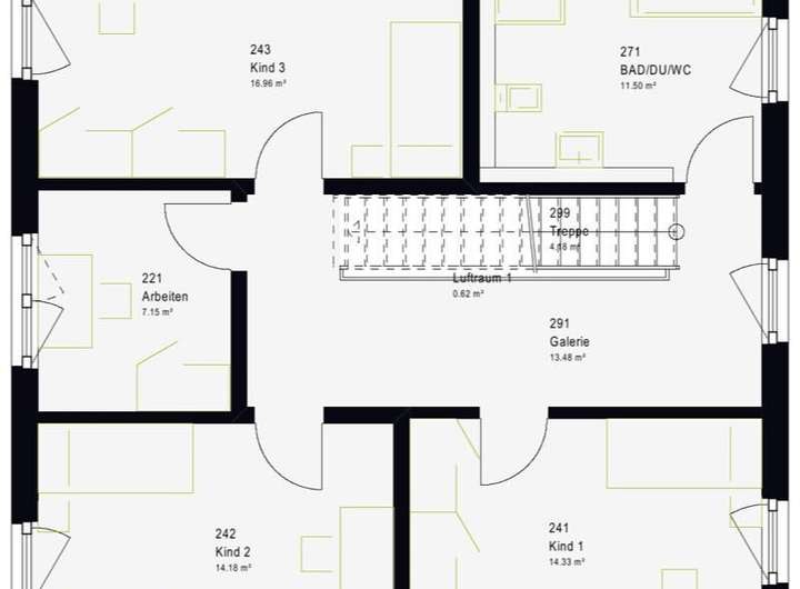Im ersten Obergeschoss befinden sich drei Kinderzimmer 🧒 sowie ein Büro 💻 - perfekt für Familienleben, Homeoffice oder kreative Entfaltung. Jeder Raum profitiert von großzügigem Tageslicht 🌞 und einer Atmosphäre voller Offenheit.