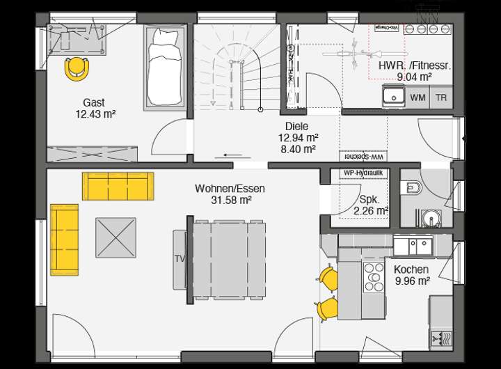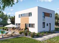 Der repräsentative Grundriss mit großem, offenen Wohn- und Essbereich und der offenen Küche, verbunden mit der praktischen Grundrissgestaltung verbinden sich zu einem ganz besonders modernen Architektenhaus. Ein großzügiges Gästezimmer und drei geräumige