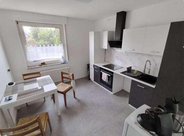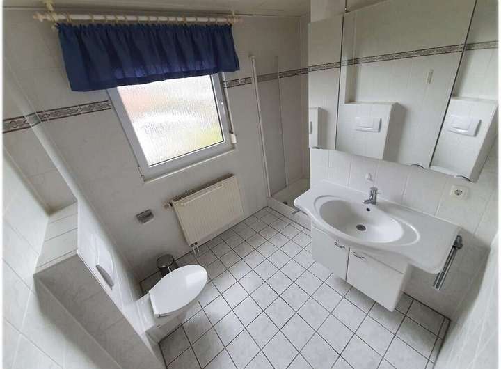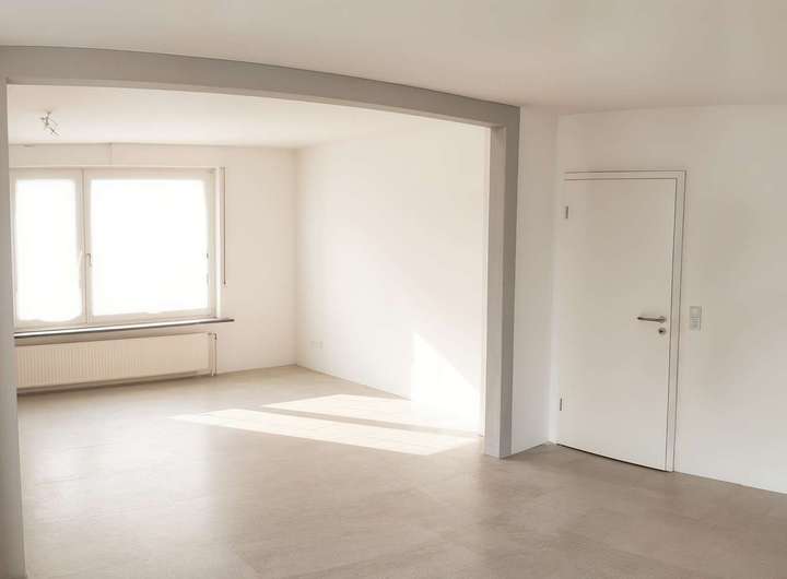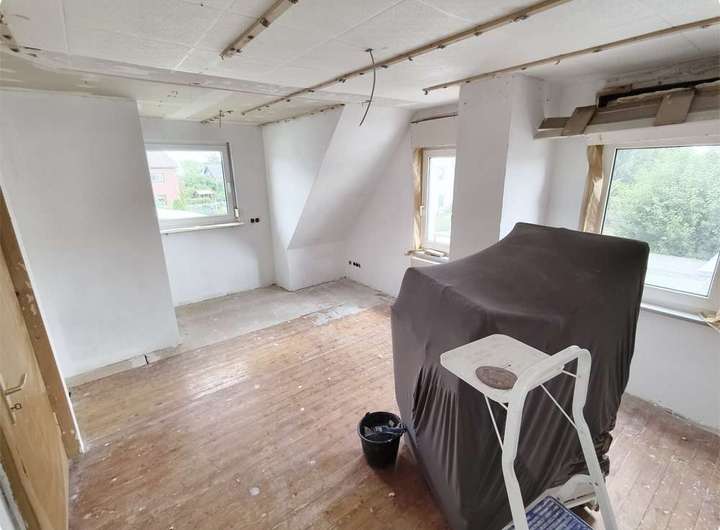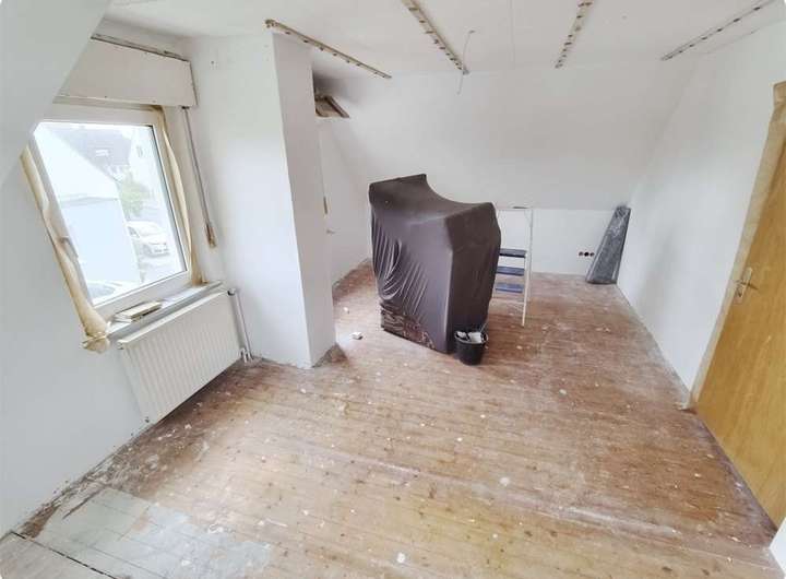 Das Erdgeschoss wird in einem komplett renovierten Zustand übergeben. Die Wände sind mit Raufaser tapeziert und die Decken sind teilweise abgehängt. Alles wird in einem frischen Weiß gestrichen, und die Fußböden sind mit hochwertigem Designvinyl erneuert worden. Neue Zimmertüren runden das Gesamtbild ab.