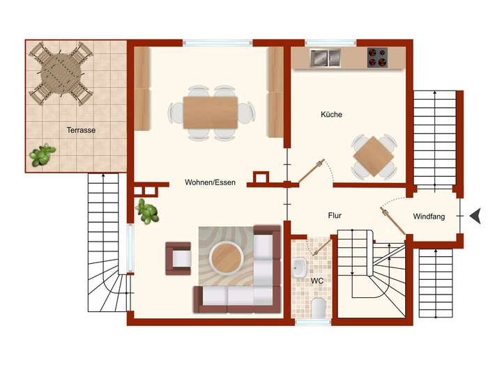 Sie betreten das Erdgeschoss, das sich im Hochparterre befindet, durch den in den 2000er Jahren angebauten Windfang. Links finden Sie ein WC, während Sie geradeaus in das Wohn-Esszimmer gelangen, das über einen Durchbruch mit dem angrenzenden Wohnzimmer verbunden ist. Die Küche, ausgestattet mit einer neuen Einbauküche, erreichen Sie ebenfalls über den Flur. Vom Wohnzimmer aus haben Sie Zugang zur überdachten Gartenterrasse, die ideal für entspannte Stunden im Freien ist.