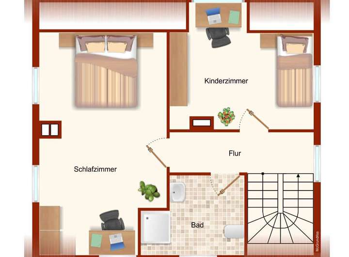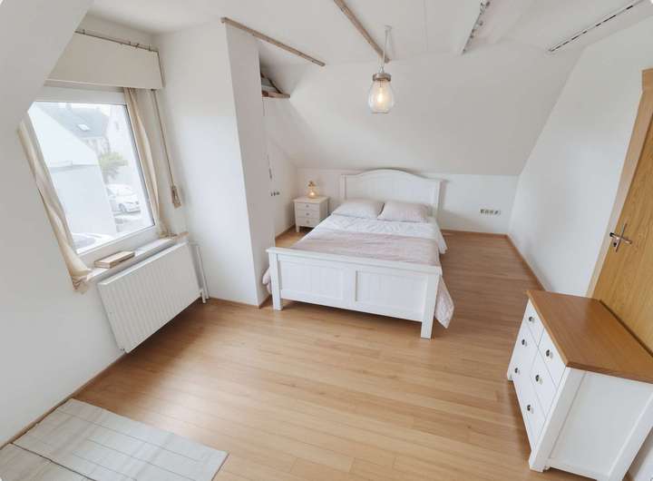 Eine Treppe im Flur führt nach links ins ausgebaute Dachgeschoss. Dort stehen Ihnen zwei Schlafzimmer und ein Duschbad mit WC zur Verfügung, ideal für die Bedürfnisse einer kleinen Familie.