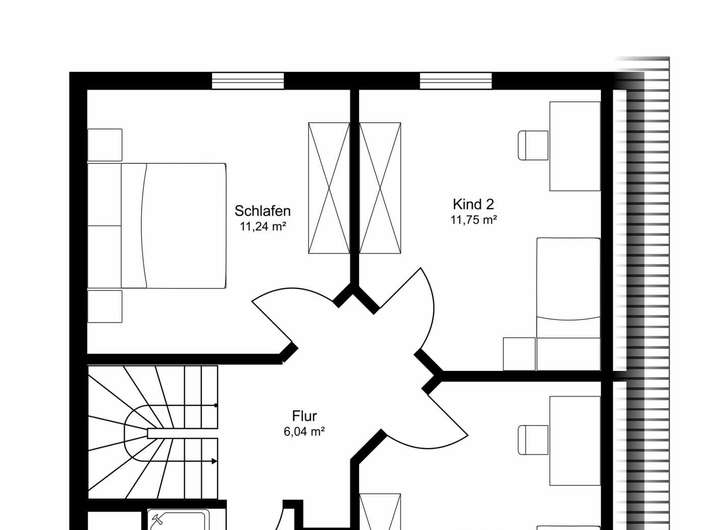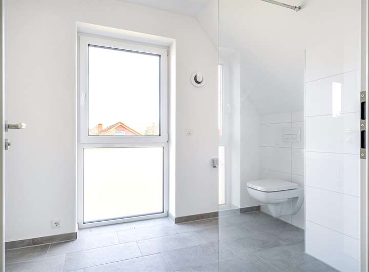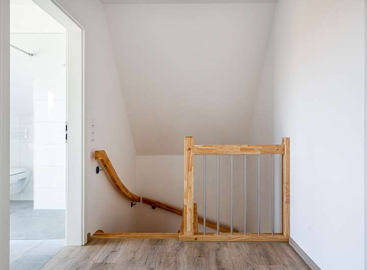 Das Obergeschoss bietet drei gemütliche Zimmer sowie ein helles Tageslichtbad mit ebenerdiger Dusche. Für ein angenehmes Wohngefühl sorgt die Fußbodenheizung in allen Räumen. Die umweltfreundliche Luft-Wasser-Wärmepumpe gewährleistet eine energieeffiziente Beheizung.
