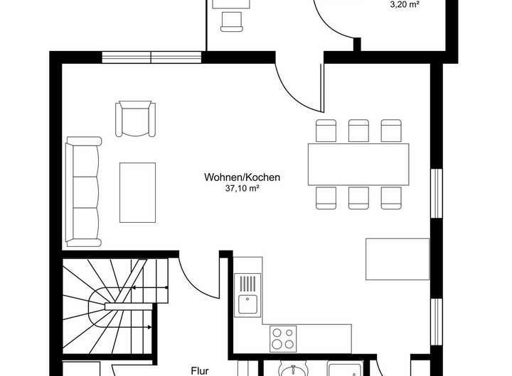 Auf ca. 110 m² Wohn- und Nutzfläche überzeugt das Haus mit einem großzügigen Wohnbereich samt offener Küche, einem Gäste-WC und einem praktischen Hauswirtschaftsraum mit Anschlüssen für Waschmaschine und Trockner im Erdgeschoss.