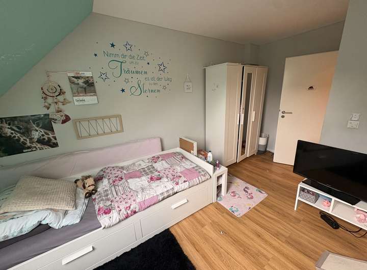Im Dachgeschoss befindet sich ein weiterer, großzügiger Raum, der flexibel genutzt werden kann – ob als Elternschlafzimmer, Hobbyraum oder Homeoffice. So passt sich das Haus perfekt den Bedürfnissen moderner Familien an.