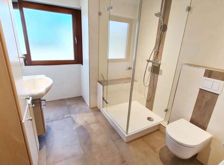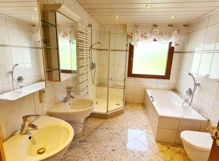 Parkettfußboden im Wohnzimmer; Isolierverglasung; Bäder zum Teil Feinsteinzeugfliesen hell; beheizt wird mit einer Gas-Zentralheizung.