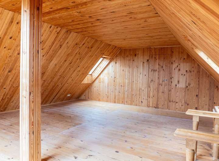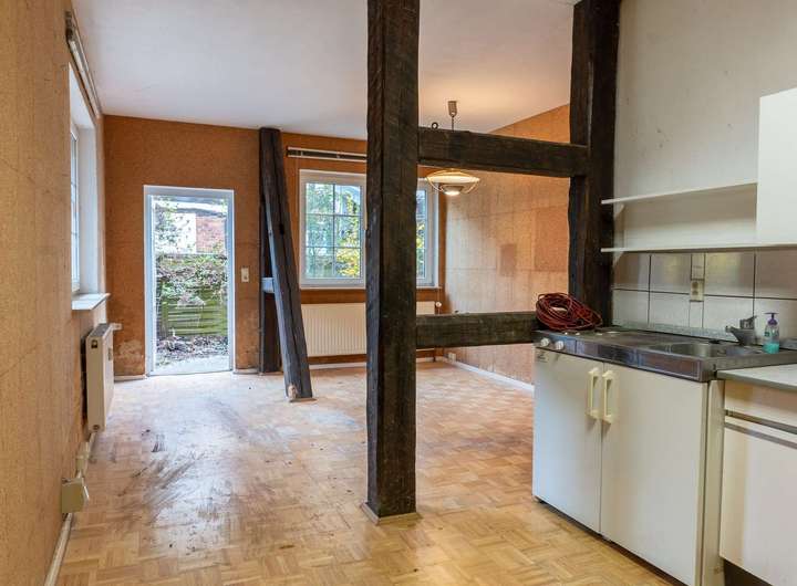 - Teilweise freiliegende Holzbalken