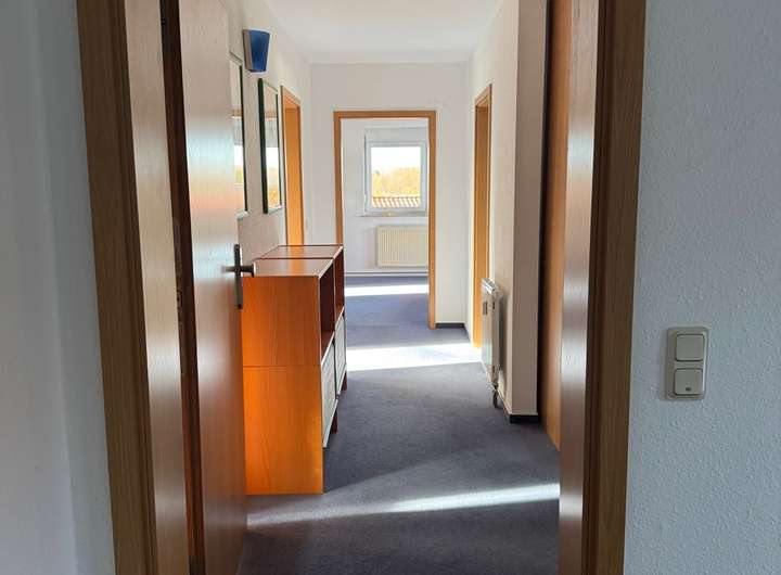 Teppichboden in allen Wohn- und Schlafzimmern, außer Badezimmer und Küche. Badezimmer mit Tageslicht, Dusche und Badewanne. Zweifach verglaste Fenster, die viel Tageslicht in die Wohnung lassen.