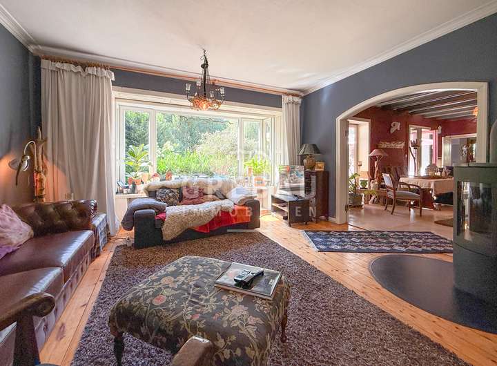 Ursprünglich wurde das Haus um 1948 auf diesem herrlichen Grundstück im Landhausstil erbaut, in den 1970er Jahren erneuert und 1994 um einen Anbau erweitert. Das ca. 350 m² große Gebäude wird derzeit von drei Wohnparteien genutzt und wird nach Absprache frei geliefert. Der überwiegende Teil des Hauses entspricht in der technischen und optischen Ausstattung dem Baujahr und Sie werden sie erneuern wollen.
