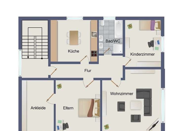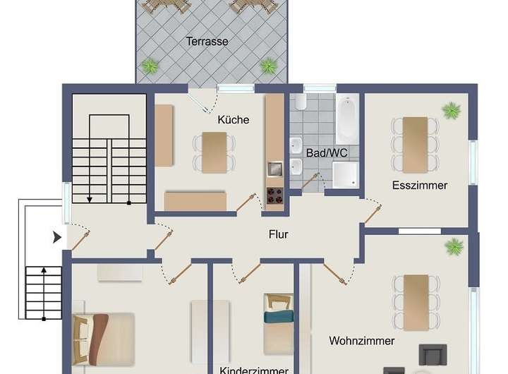 Im Erd- und Obergeschoss erwartet Sie jeweils eine 3-4 Zimmerwohnung, bestehend aus Wohn-/Essbereich, 2-3 Schlafzimmern, Küche und Bad. Die Wohnung im Erdgeschoss hat eine große Terrasse und Zugang zum Garten.