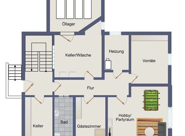 Im Keller befindet sich, neben den Nutz- und Wirtschaftsräumen, ein wohnlich ausgebauter Raum für Gäste, ein Hobby-/Partykeller, sowie ein Duschbad. Der Keller hat einen eigenen Außeneingang.