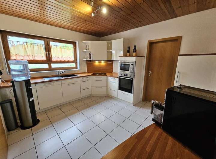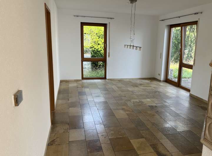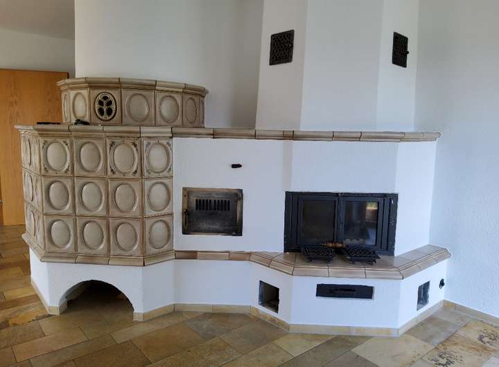 Esszimmer und Wohnzimmer, jeweils mit Kachelofen, offener Kamin, Südbalkon (Loggia), Ost-Terrasse, Diele, Küche mit Speisekammer. Das DG wird ebenfalls über eine Treppe aus Holz erreicht.