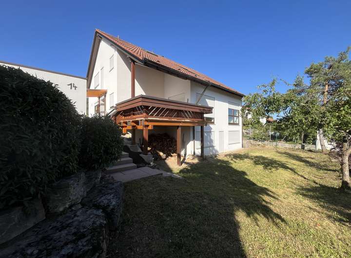 Das Einfamilienhaus mit separater, großer Doppelgarage wurde 1989 auf dem 556 m² großen, sonnigen Grundstück, angrenzend an ein Landschaftsschutzgebiet erbaut.