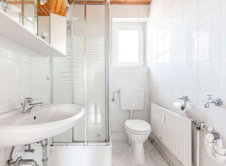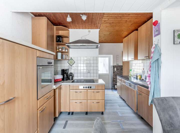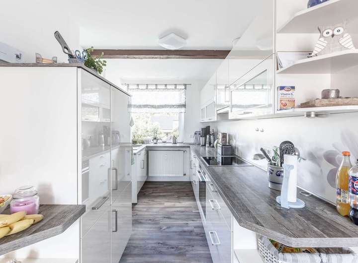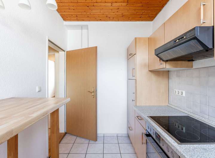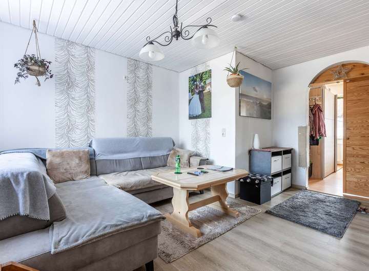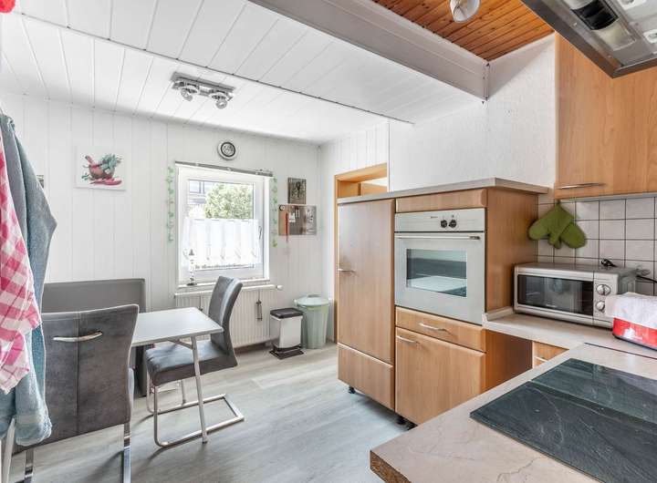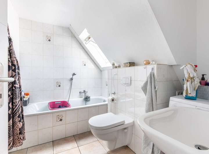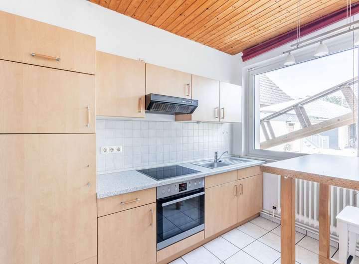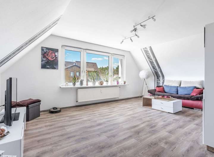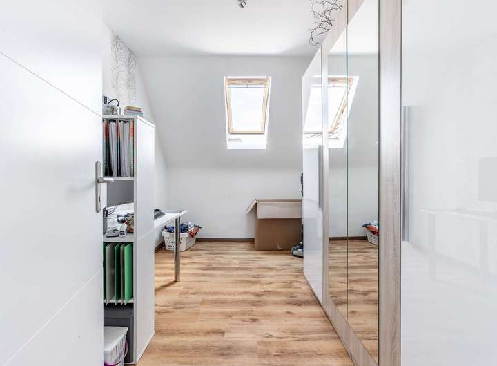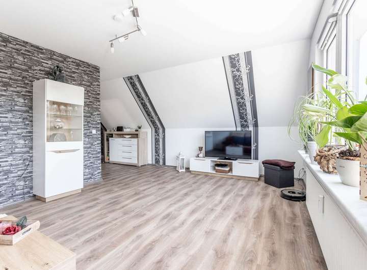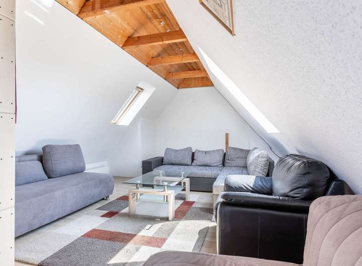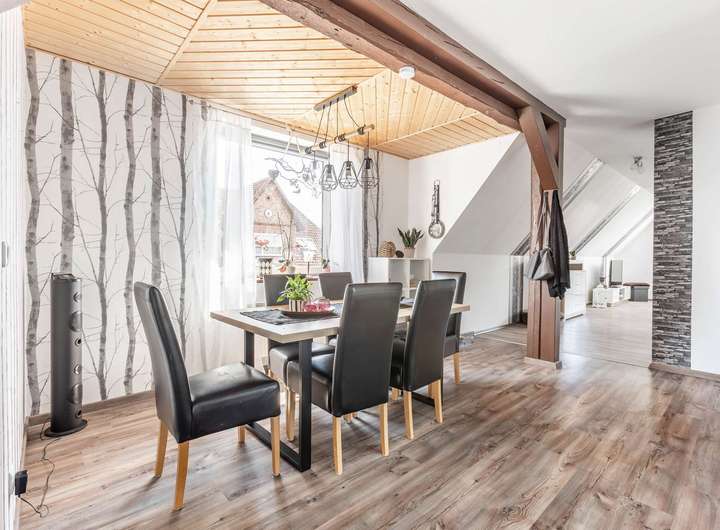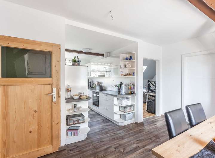 Im Obergeschoss befindet sich die dritte Wohneinheit, mit einer Wohnfläche von rund 100 Quadratmetern und einem separaten Zugang. Diese in 2022 sanierte, helle und freundliche Wohnung überzeugt durch ein modernes Badezimmer aus 2010, einen offenen Wohn-, Ess- und Küchenbereich mit sichtbaren Balken für eine besonders gemütliche Atmosphäre.