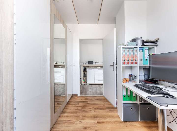 Das lichtdurchflutete Wohnzimmer sowie zwei weitere Räume bieten vielfältige Nutzungsmöglichkeiten – sei es als Schlafzimmer, Büro oder Hobbyraum. Das Badezimmer verfügt über eine Dusche und ein Fenster, das für freundliche Helligkeit sorgt. Ein kleiner Abstellraum beherbergt den Sicherungskasten und bietet weiteren Stauraum.