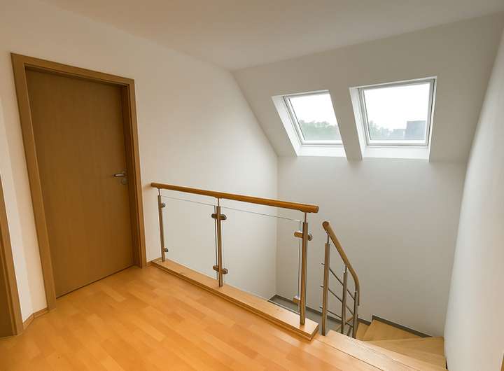 Über eine Stahltreppe mit Holzstufen erreichen Sie das Obergeschoss, wo Sie eine helle Galerie mit Blick in den Eingangsbereich des Erdgeschosses empfängt. Von der Galerie gelangen Sie in die drei geräumigen Schlafzimmer, die mit Laminat ausgelegt sind.