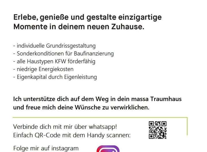 Erfüllen Sie sich jetzt den Traum vom eigenen Zuhause! Mit einem Massa Haus genießen Sie eine einzigartige Mischung aus Individualität, Wohlfühlatmosphäre und kostengünstigem Bauen. Der Grundriss wird ganz nach Ihren Vorstellungen gestaltet - für ein Zuhause, das Ihre Familie von Anfang an willkommen heißt.