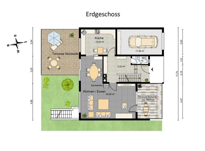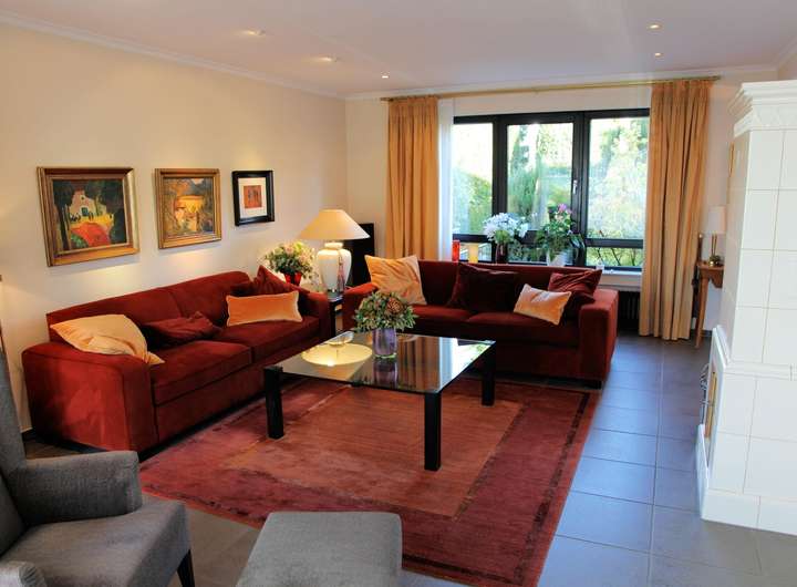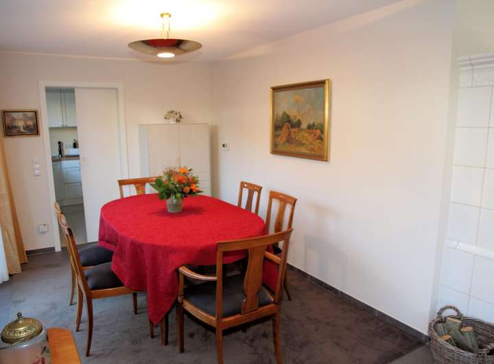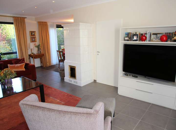 Im Erdgeschoss gibt es neben dem Flur ein Gäste-WC (renoviert 2009) mit hellem Granitboden, einen großzügigen lichtdurchfluteten Wohn - und Essbereich mit direktem Zugang zur Küche. Eine große Schiebetür führt vom Essbereich zu einer Nord-Terrasse und vom Wohnbereich zu einer Süd-Terrasse mit sehr gepflegten Gärten. Ein Kachelofen im Wohnbereich speichert die Wärme in Schamottesteinen und gibt sie an den Raum ab.
