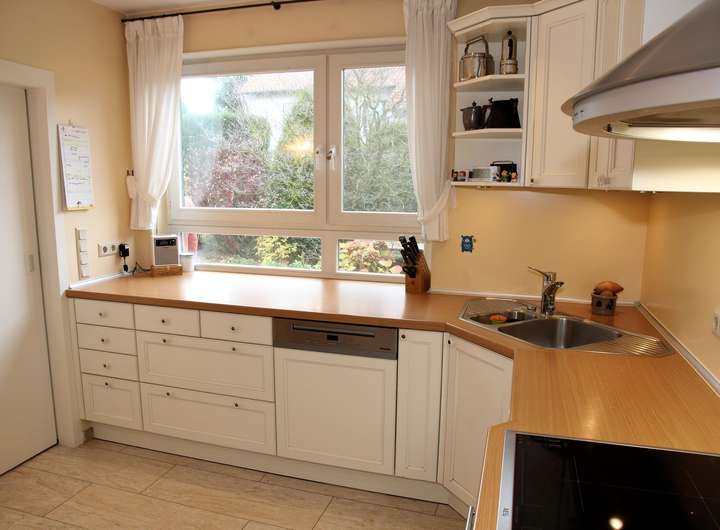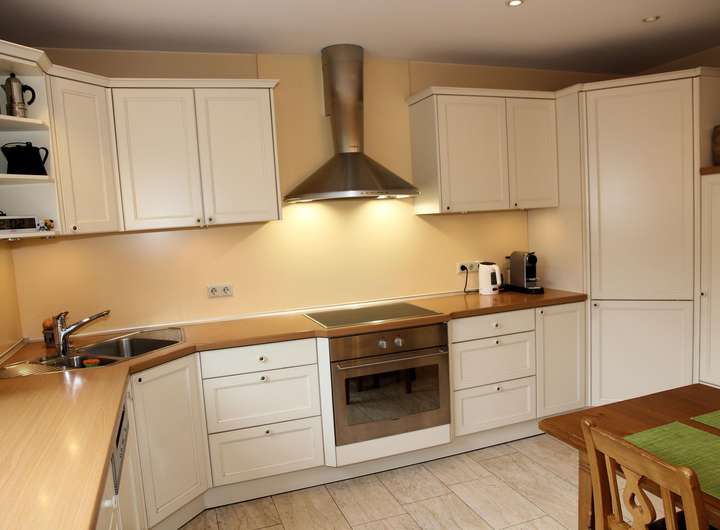 Die vorhandene hochwertige Miele Einbauküche ist mit Echtholz-Türen sowie mit Marken-Elektrogeräten (NEFF- Kühlschrank, Miele-Geschirrspüler aus 2024, AEG- Herd mit Abluft - Abzugshaube) ausgestattet.
