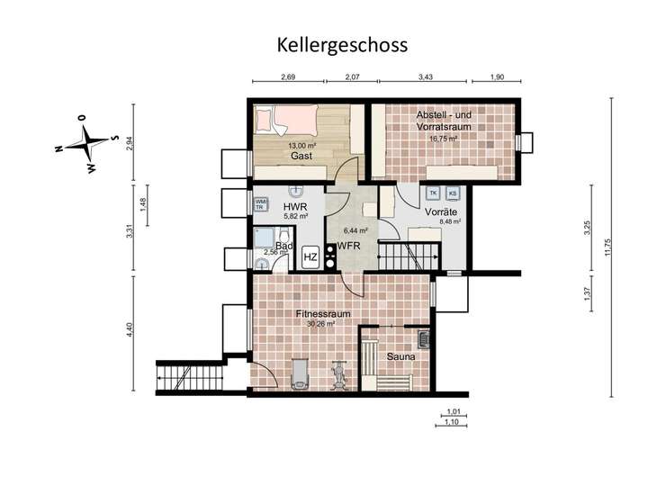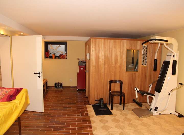 Das Haus, einschließlich Garage ist vollflächig unterkellert. Der Keller hat eine nutzbare Fläche von 107 qm und alle Räume sind mit Fenstern ausgestattet. Der größte Raum, mit 30,26 qm (beheizt) wurde als Fitnessraum (terrakottafarbigen Bodenfliesen) mit eingebauter Sauna ausgestattet und einem angrenzenden weißem gefliestem Badezimmer eingerichtet. Eine massive Stahltüre führt zur Garten Nord - Seite.