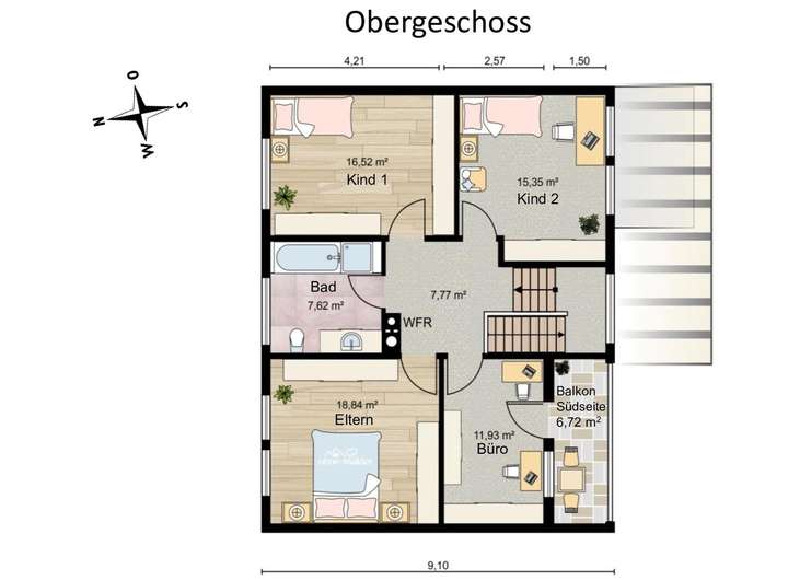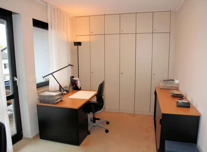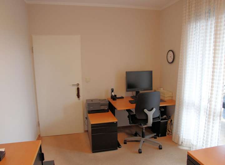 Das helle, bestehende Arbeitszimmer an der Südseite hat einen Zugang zu einem sehr schönen und geräumigen Balkon.