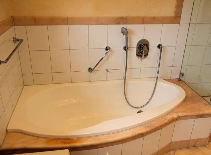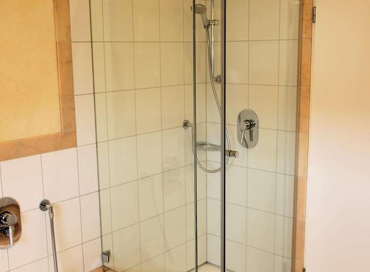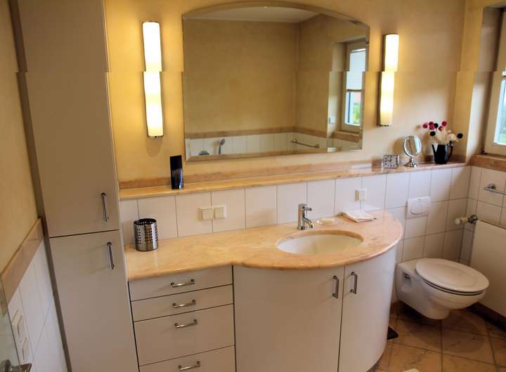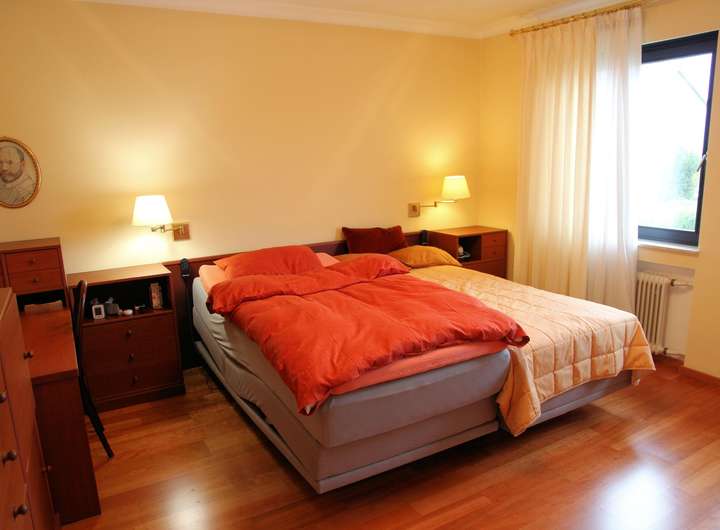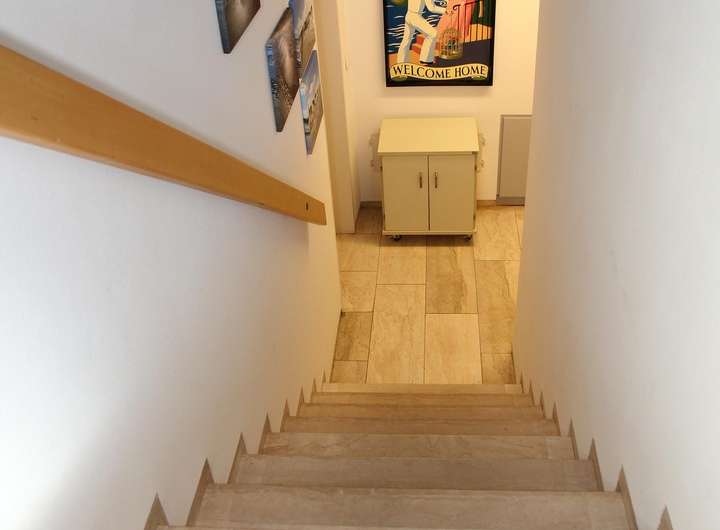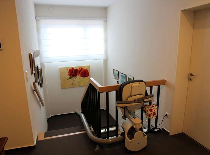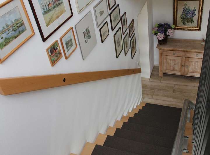Durch das helle Treppenhaus gelangt man in das Obergeschoss. Ein Treppenlift wurde für die Verbindung zum Obergeschoss im Jahr 2021 angebaut. Im Obergeschoss gibt es 4 Zimmer, 2 Zimmer mit Teppichboden und 2 Zimmer mit Parkett, sowie ein geräumiges hochwertiges Tageslichtbad mit Dusche und Wanne (renoviert 2002). Der Boden sowie das Waschbecken im Bad bestehen aus lachsfarbigem Marmor.