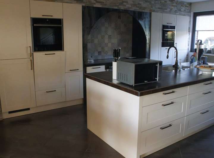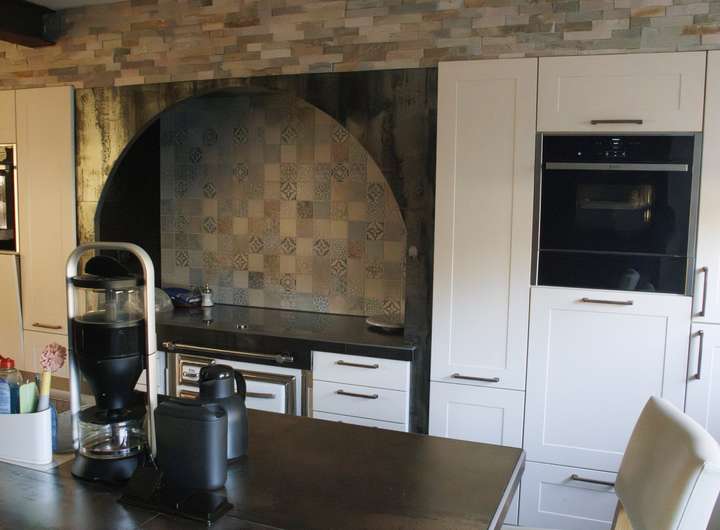 Erdgeschoß zu einem offenen Raumgefüge umgestaltet (Loft). Der Küchenbereich besteht aus einem separaten maßgefertigten Kochbereich mit Insel, Essbereich u. Kohle Backofen.
