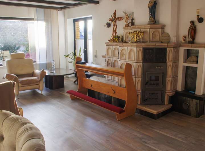 - Großer Kachelofen im zentralen Wohnbereich