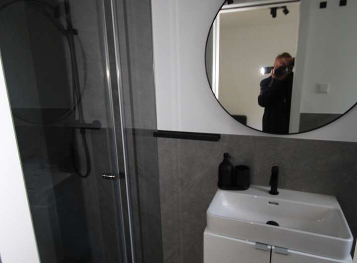 Im Obergeschoss empfängt ein weitläufiger Wohnsalon mit einer raumhohen Fensterfront zur Südseite die Bewohner und bietet viel Tageslicht. Hier befinden sich außerdem das Schlafzimmer sowie ein weiteres Duschbad.