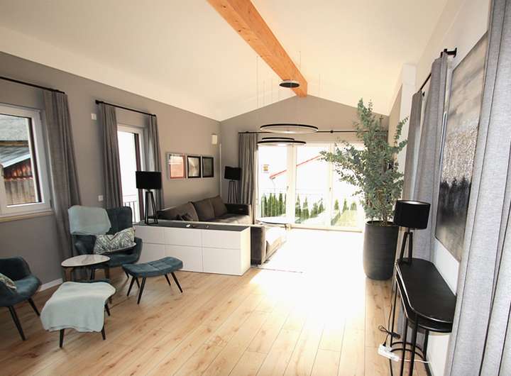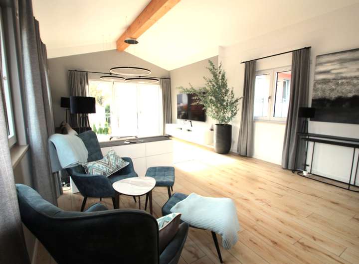 Besonders hervorzuheben ist der direkte Zugang von der Wohnküche über die große Südterrasse und zum Garten hin, wodurch sich die Innenräume harmonisch mit dem Außenbereich verbinden und ein lichtdurchflutetes, offenes Wohngefühl entsteht.