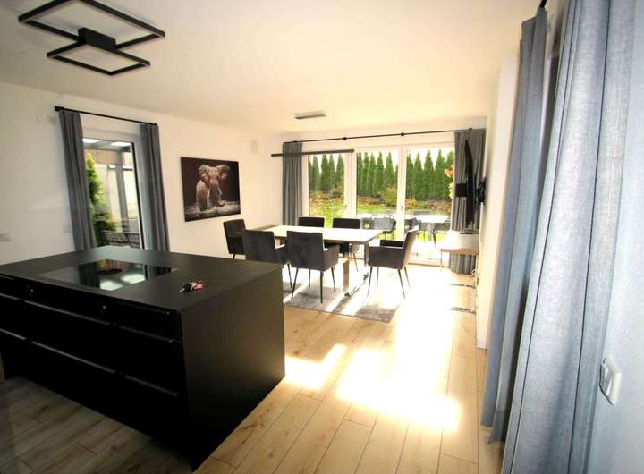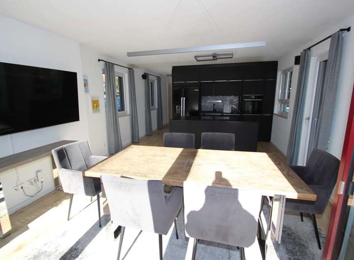 Im Erdgeschoss befindet sich eine modern konzipierte Wohnküche (30 qm) mit Kochinsel. Der integrierte Essbereich bietet Platz für einen großen Esstisch, der zu gemeinsamen Mahlzeiten und geselligem Beisammensein einlädt.