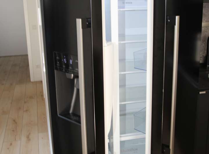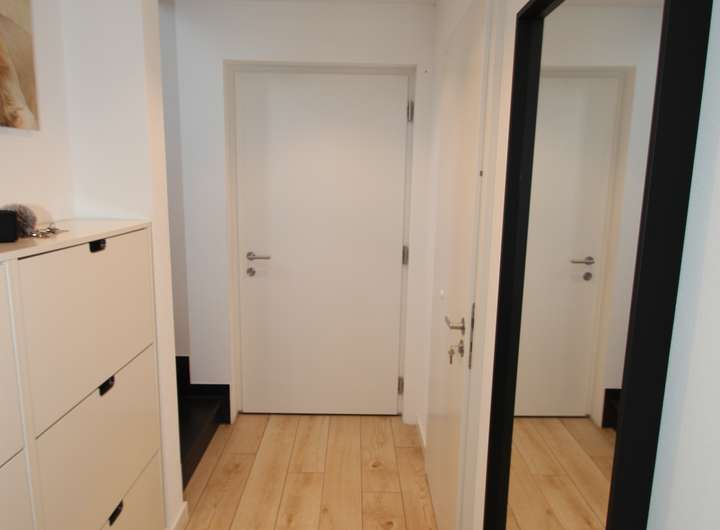 Alle Wohnraum Fenster haben elektrische Rollläden, die eine komfortable und flexible Steuerung des Lichteinfalls ermöglichen. Der Dielenboden in heller Holzoptik verleiht den Räumen eine freundliche und moderne Atmosphäre. Für ausreichend Stauraum sorgen die eingebauten Schränke mit Hochglanzoberfläche, die nicht nur praktisch, sondern auch optisch ansprechend sind. Die großzügige Wohnlandschaft bietet viel Platz für gemütliches Beisammensein und Entspannung. In der hochwertig ausgestatteten Marken-Küche befindet sich eine XXL-Kühleinheit, die ausreichend Raum für Lebensmittel und Getränke bereithält. Die Kücheninsel ist mit einem Bodenabzug ausgestattet.