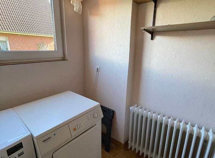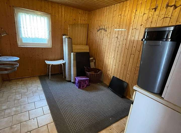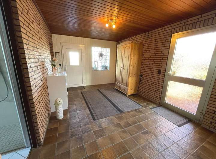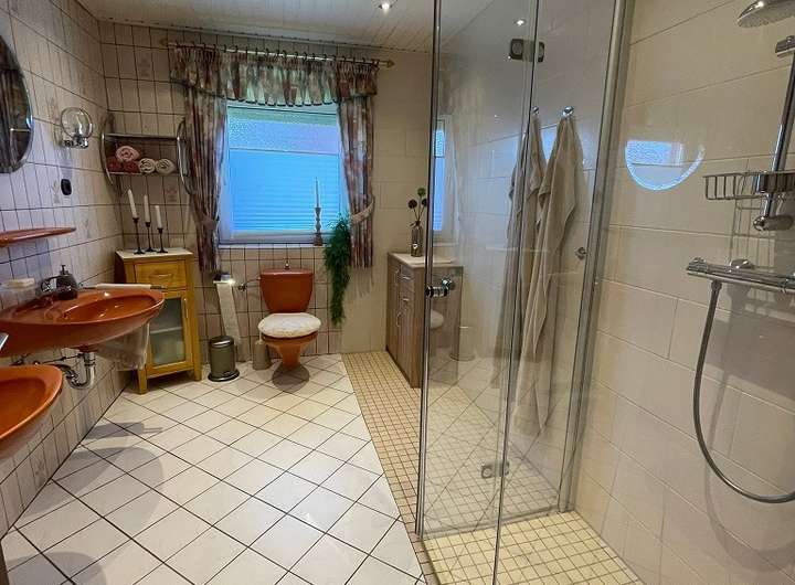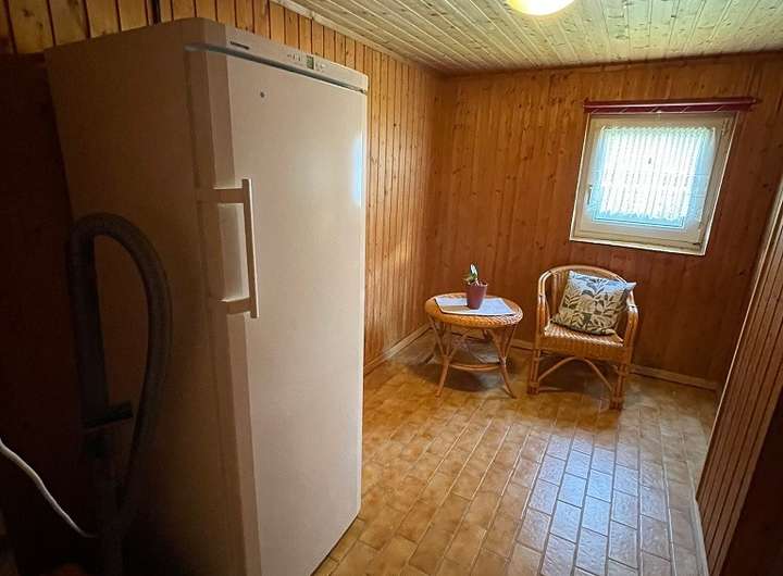 Der Anbau beherbergt ein modernes Badezimmer mit ebenerdiger Dusche, eine große Diele sowie einen praktischen Hauswirtschaftsraum. Ein Kellerraum steht für zusätzlichen Stauraum zur Verfügung.
