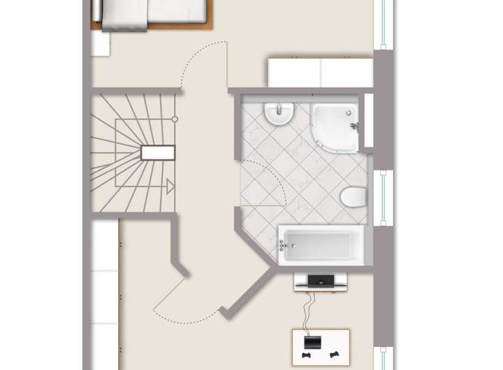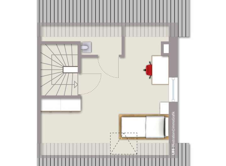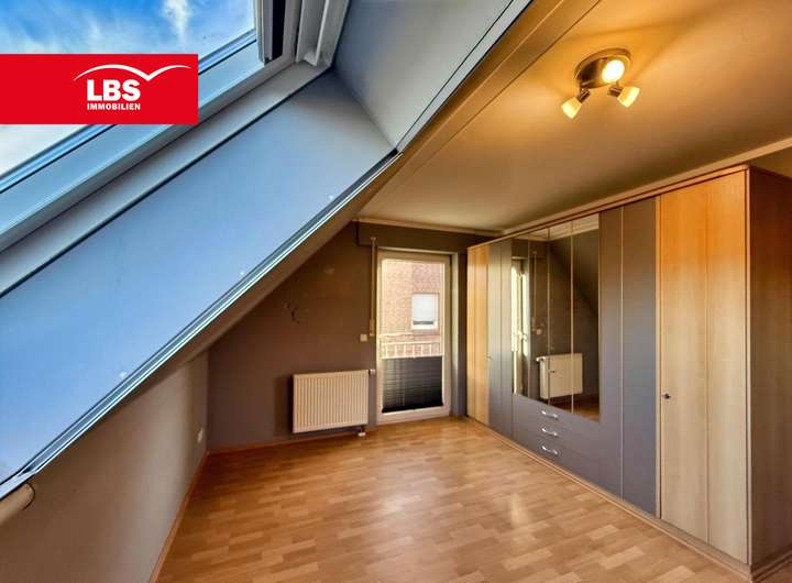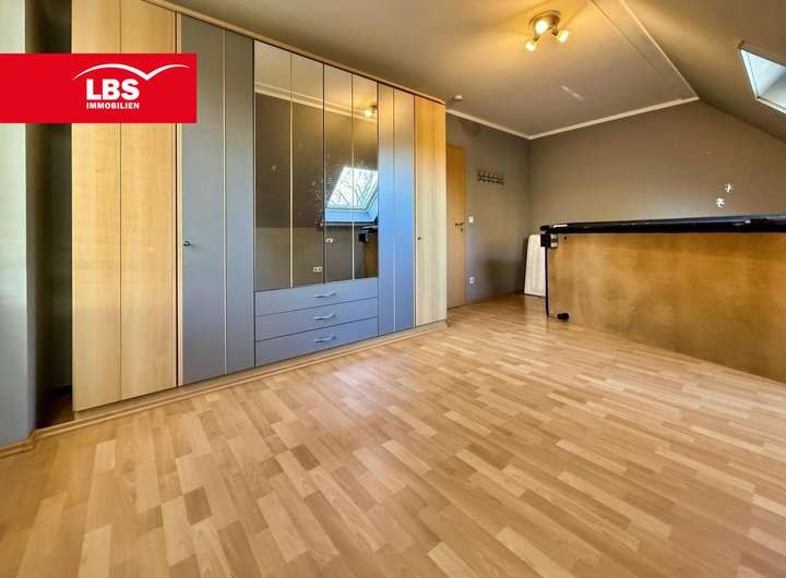 Das Obergeschoss beherbergt zwei gut geschnittene Schlafzimmer sowie ein großzügiges Tageslichtbad, ausgestattet mit Dusche, Badewanne, WC und Doppelwaschbecken. Eine offene Treppe führt in das ausgebaute Dachgeschoss, das einen weiteren, vielseitig nutzbare Raum bietet – perfekt als Kinder-, Arbeits- oder Gästezimmer.