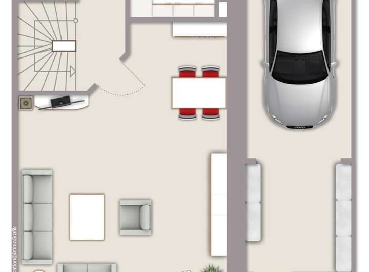 Im Erdgeschoss empfängt Sie ein offener Wohn- und Essbereich mit Zugang zur Terrasse – ideal für gemütliche Stunden im Freien bei jedem Wetter. Die Einbauküche mit integriertem Essplatz überzeugt durch Funktionalität und stilvolles Design. Ein Gäste-WC mit Dusche sowie ein praktischer Abstellraum komplettieren diese Etage.