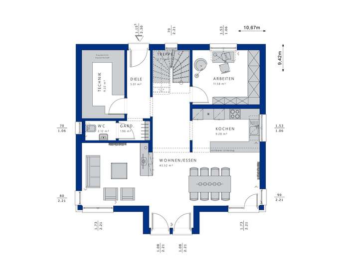 Mit der gewählten Ausbaustufe ZAF haben Sie die Möglichkeit, selbst kreativ zu werden! Während Bien-Zenker sich um den Rohbau und den technischen Innenausbau kümmert, liegt es an Ihnen, Böden auszuwählen, Wände zu gestalten und die Sanitäranlagen nach Ihrem Geschmack einzurichten. Diese Flexibilität bedeutet nicht nur eine persönliche Note in Ihrem neuen Heim, sondern auch finanzielle Vorteile durch Eigenleistung - perfekt für alle Häuslebauer mit handwerklichem Geschick.