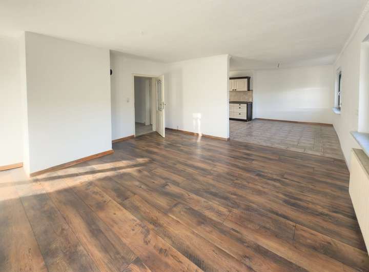 Drei helle Räume, darunter ein großzügiges Wohnzimmer mit geplanter Installation eines freistehenden Kamins